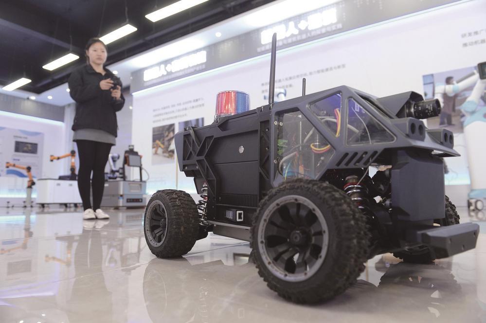 中关村机器人产业创新中心“机器人+”展示体验中心内工作人员正在调试自动驾驶微型车。